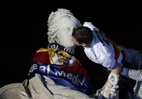 Avant, on pouvait se baigner à la Cibeles. Ensuite, on a restreint l'accès à l'eau, pour le réserver aux joueurs. Et un jour, la mairie a décidé que personne n'approcherait plus la fontaine. Heureusement, en 2007, lors du trentième titre de champion d'Espagne, le capitaine, a eu accès à l a déesse, via un échafaudage. Il lui a mis une écharpe du Real autour du cou. Depuis, c'est une tradition qui s'ajoute à la tradition.